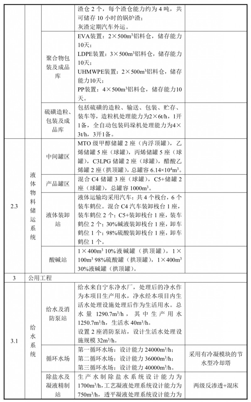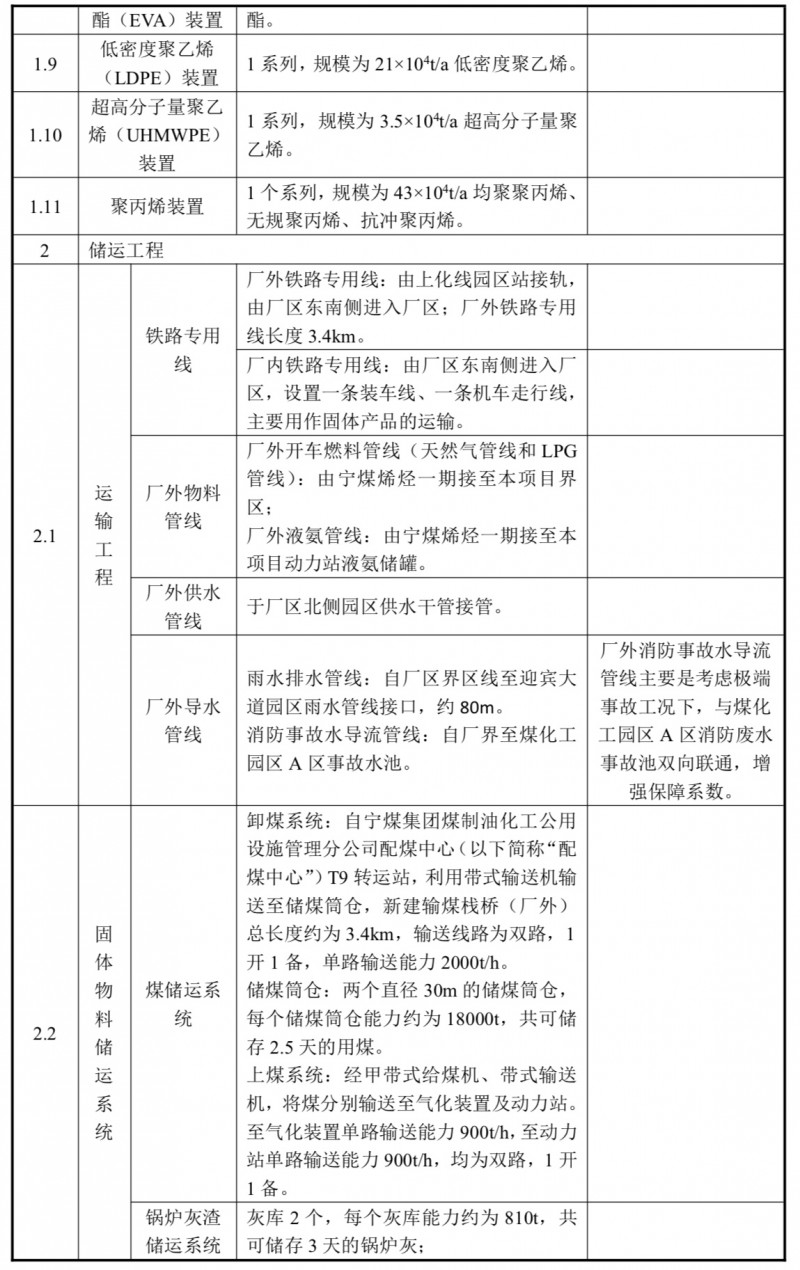 据悉,该项目以煤为原料生产200万吨甲醇并进一步加工生产聚合级乙烯、丙烯,最终生产34.5万吨/年聚乙烯、42万吨/年聚丙烯;同时副产硫磺、硫铵等副产品;另外配套建设储运工程、公用工程、辅助工程以及环保工程。依托工程包括宁煤烯烃一期空压站、配煤中心、宁东净水厂、园区事故水池、场外供电工程、基地渣场、宁东清大危废处置中心。