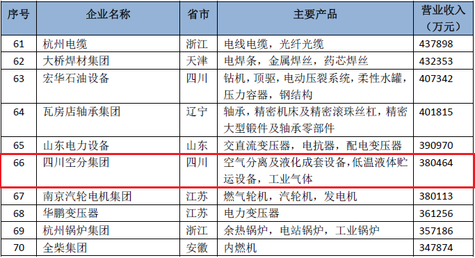 其中,气体分离设备行业有4家企业入围,分别是杭州杭氧股份有限公司、四川空分设备(集团)有限责任公司、沈阳鼓风机集团股份有限公司、陕西鼓风机(集团)有限公司,这4家企业营业收入共计2891249万元。