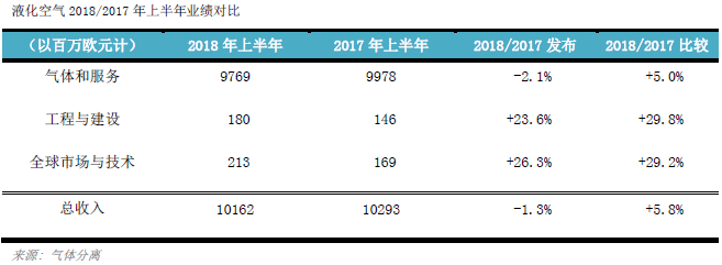 法国液化空气集团2018年上半年营业收入为102亿欧元(119亿美元),同比增长5.8%。